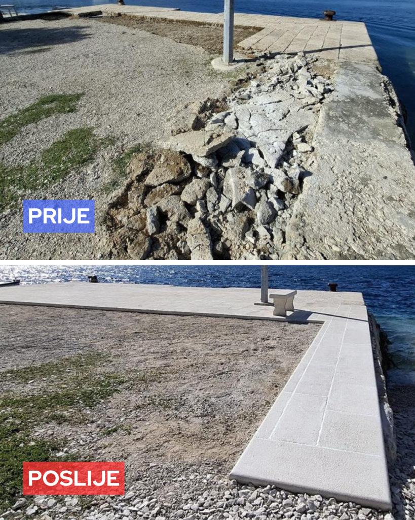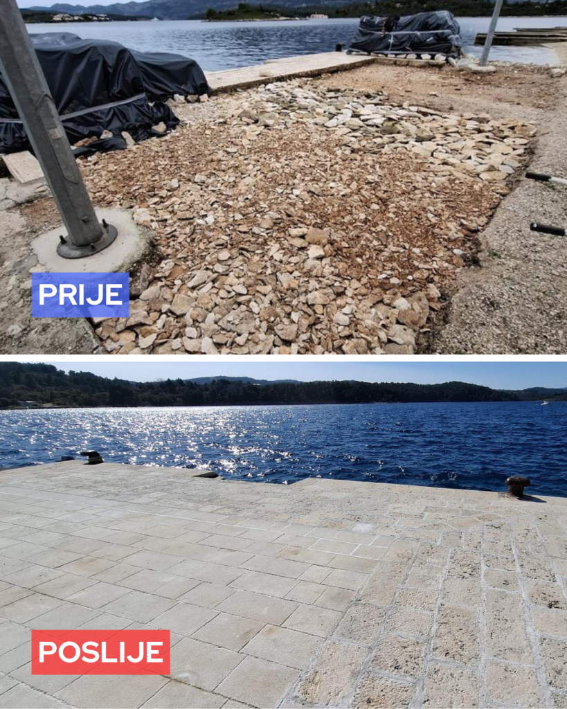 Popločali smo betonirani dio mola koji služi kao glavno pristanište za stanovnike i posjetitelje Vrnika, kako bi se poravnao s ostatkom popločane obale.